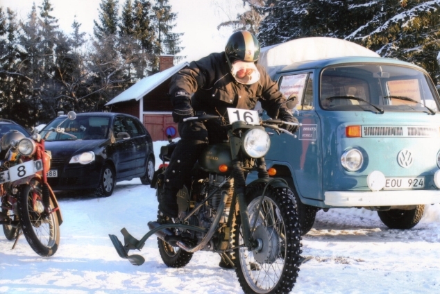 ![]() Hans Varverud, Motala kickar igÄng sin Royal Enfield Replica 350cc, -60. |