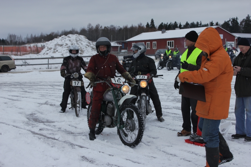 Klart för start. Tre av Motalaåkarna, nr 16 Hans Karlsson på Greeves, |