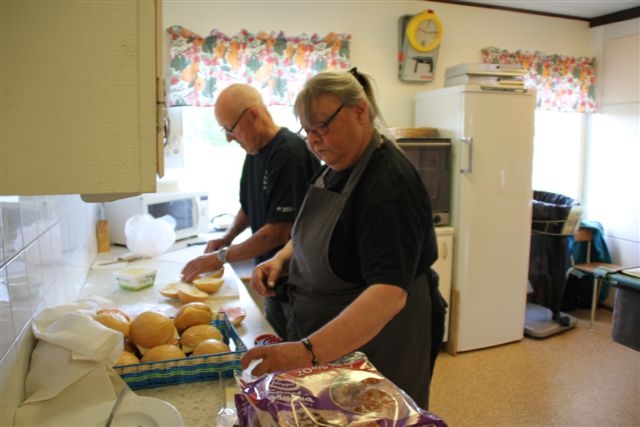 Kökspersonalen i full fart med att breda mackor.